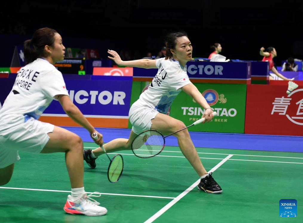 Xiao En Heng/Jin Yu Jia (R) of Singapore compete in the women's doubles match against Kim Hye Jeong/Kong Hee Yong of South Korea during the Group Z match between Singapore and South Korea at Badminton Asia Team Championships 2026 in Qingdao, east China's Shandong Province, Feb. 3, 2026. (Xinhua/Li Ziheng)
