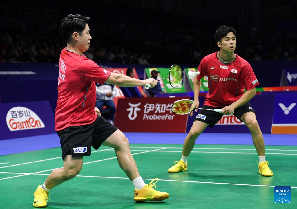 Hoki Takuro (L)/Kobayashi Yugo of Japan compete in the men's doubles match against Eng Keat Wesley Koh/Donovan Willard Wee of Singapore during the Group C match at Badminton Asia Team Championships 2026 in Qingdao, east China's Shandong Province, Feb. 3, 2026. (Xinhua/Li Ziheng)