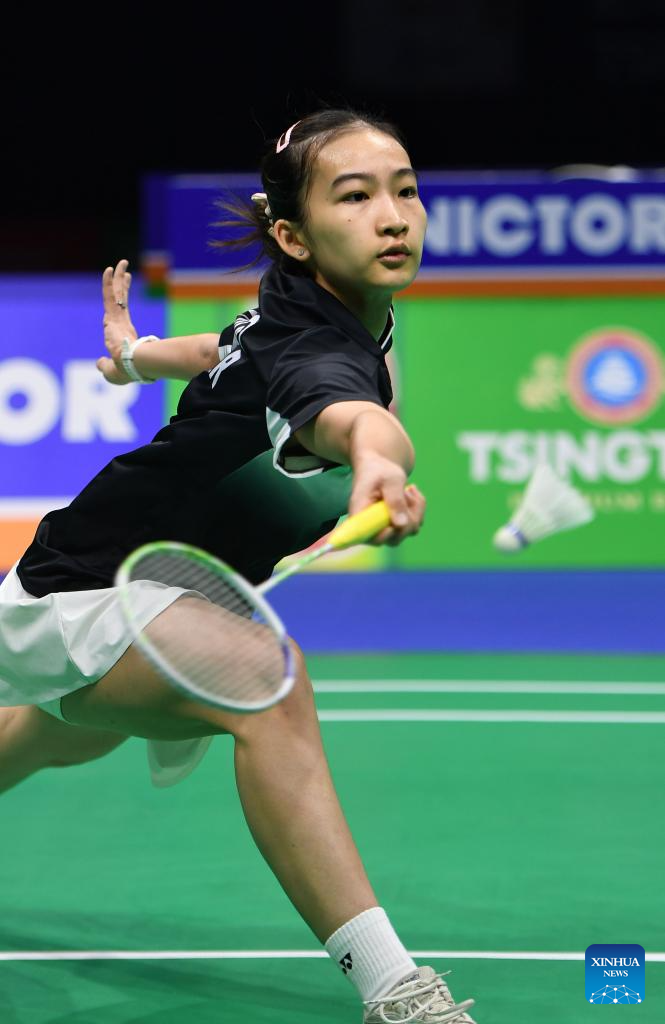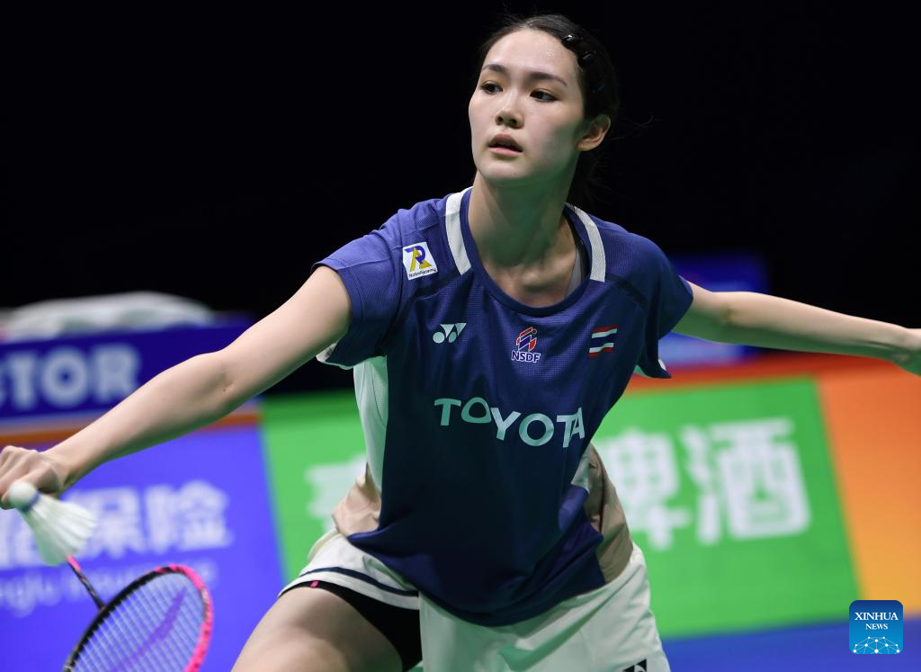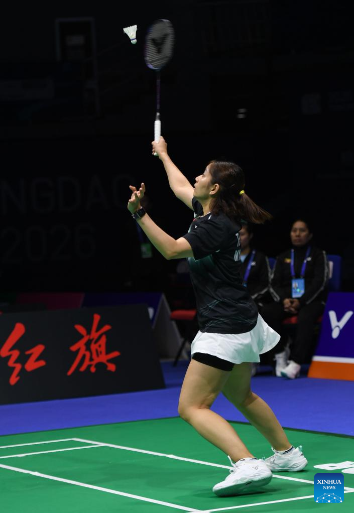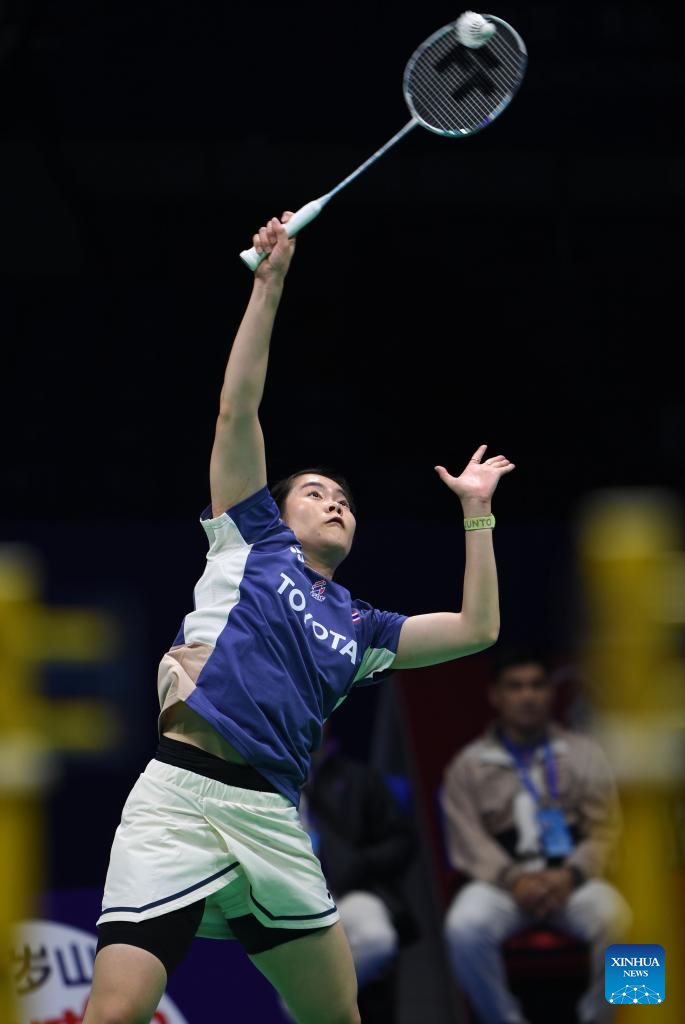 Busanan Ongbamrunghan of Thailand competes in the women's singles match against Thet Htar Thuzar of Myanmar during the Group Y match between Thailand and Myanmar at Badminton Asia Team Championships 2026 in Qingdao, east China's Shandong Province, Feb. 3, 2026. (Xinhua/Li Ziheng)