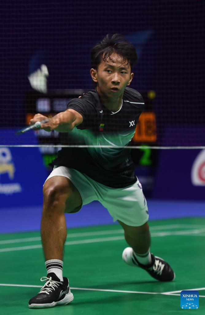 Hein Htut of Myanmar hits a return during the men's singles match against Prahdiska Bagas Shujiwo of Indonesia during the men's team group D match between Indonesia and Myanmar at Badminton Asia Team Championships 2026 in Qingdao, east China's Shandong Province, Feb. 3, 2026. (Xinhua/Li Ziheng)