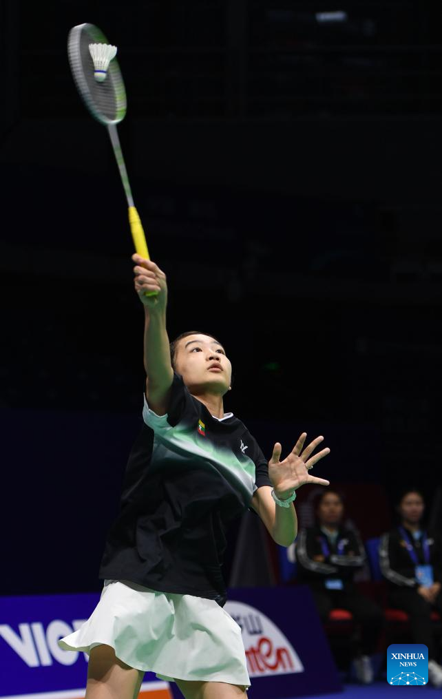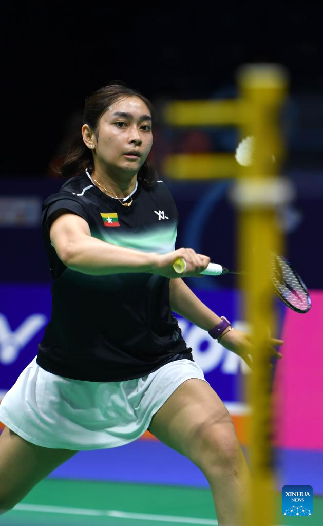 Thet Htar Thuzar of Myanmar hits a return in the women's singles match against Busanan Ongbamrunghan of Thailand during the Group Y match between Thailand and Myanmar at Badminton Asia Team Championships 2026 in Qingdao, east China's Shandong Province, Feb. 3, 2026. (Xinhua/Li Ziheng)