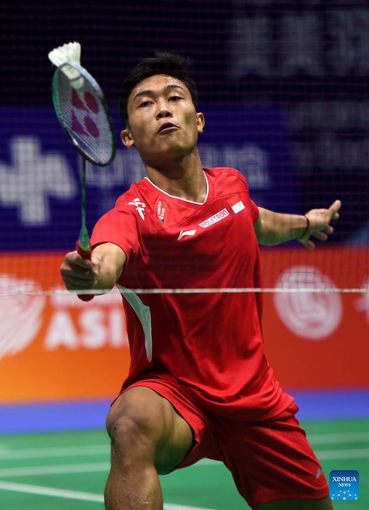 Richie Duta Richardo of Indonesia hits a return in the men's singles match against Lal Zuidika of Myanmar during the men's team group D match between Indonesia and Myanmar at Badminton Asia Team Championships 2026 in Qingdao, east China's Shandong Province, Feb. 3, 2026. (Xinhua/Li Ziheng)