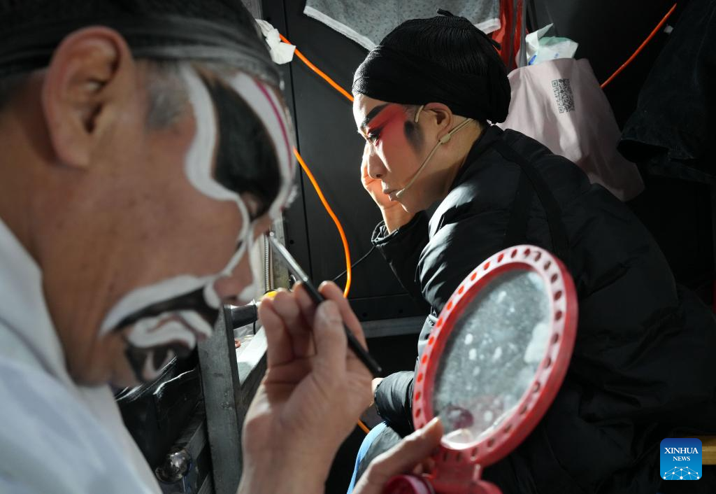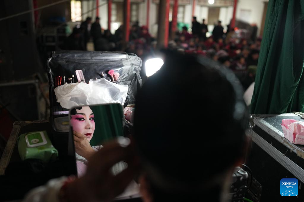 An artist prepares to perform Wuju Opera in Wucun Village, Wucheng District of Jinhua City, east China's Zhejiang Province, Jan. 27, 2026.