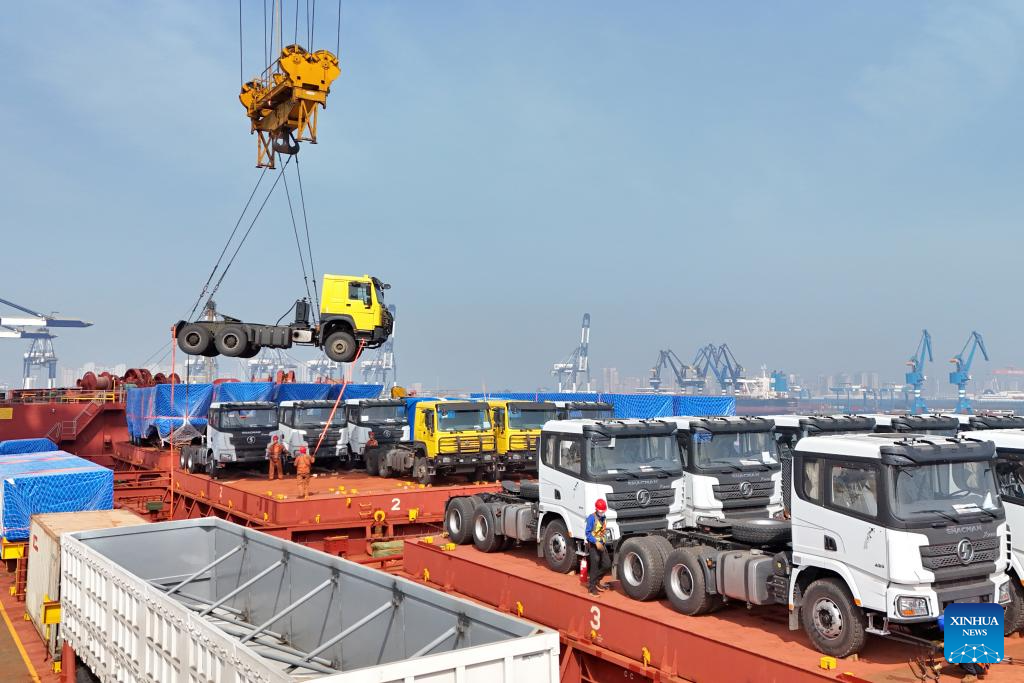 A drone photo taken on April 14, 2026 shows a truck for export being hoisted onto a China-Africa liner at Yantai Port in east China's Shandong Province. China's foreign trade grew 15 percent year on year in the first quarter (Q1) of 2026, data from the General Administration of Customs showed on Tuesday.