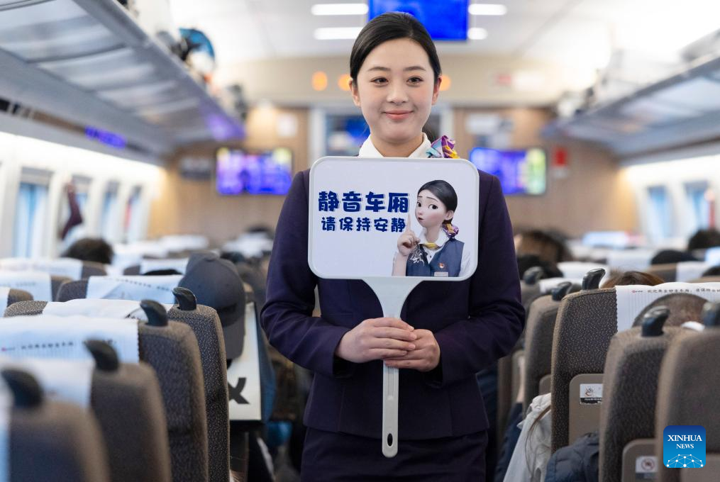 A train attendant holds a "Keep Quiet" placard at a quiet car on train No. G12 travelling from east China's Shanghai to Beijing, capital of China, on Feb. 1, 2026. More than 8,000 high-speed trains across China will provide quiet car services starting from Feb. 1, 2026. (Xinhua/Wang Xiang)