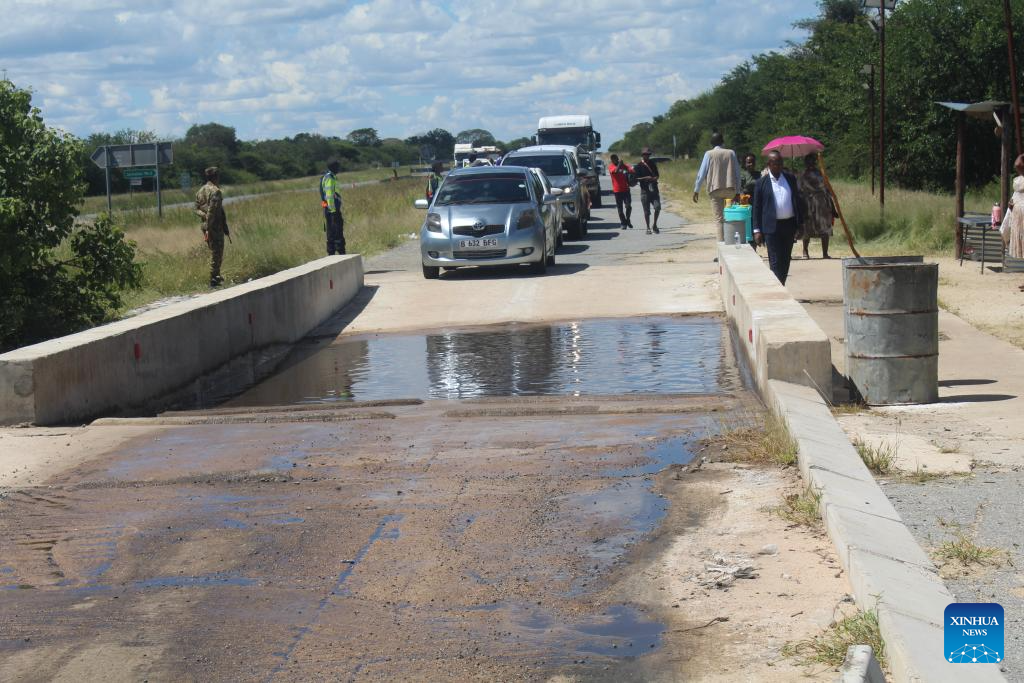 Vehicles wait to go through a disinfection pool at a disease control station along the road of Francistown-Jackalas I Village in North East District, Botswana, Feb. 1, 2026. Botswanan veterinary authorities on Sunday confirmed an outbreak of foot-and-mouth disease (FMD) at a village in the northeastern part of the southern African country, near the border with Zimbabwe. (Photo by Shingirai Madondo/Xinhua)
