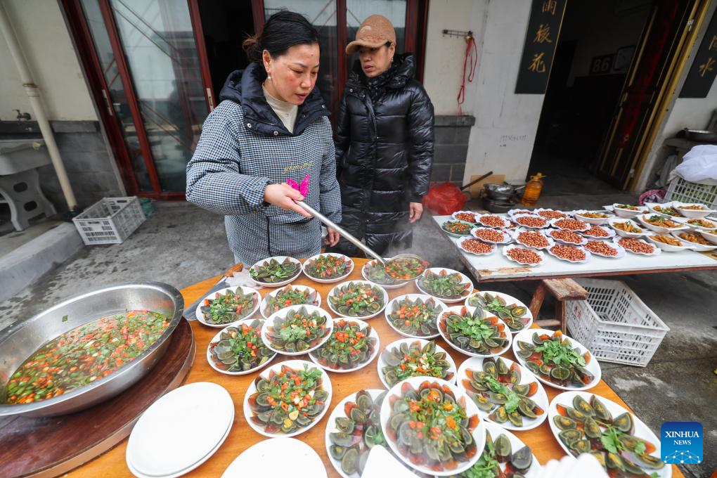 Tourists and local residents dine together in Lianhua Township, east China's Zhejiang Province, Feb. 1, 2026. A Spring Festival cultural event was held here with great enthusiasm on Sunday. Local residents and tourists enjoyed the festive market, viewed the local art exhibition, participated in traditional games, and savored local foods. (Xinhua/Xu Yu)