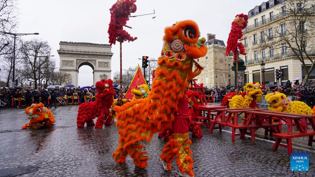 Artists perform a lion dance during a parade celebrating the upcoming Chinese New Year on the Champs-Elysees avenue in Paris, France, Feb. 1, 2026. (Xinhua/Zhang Baihui)