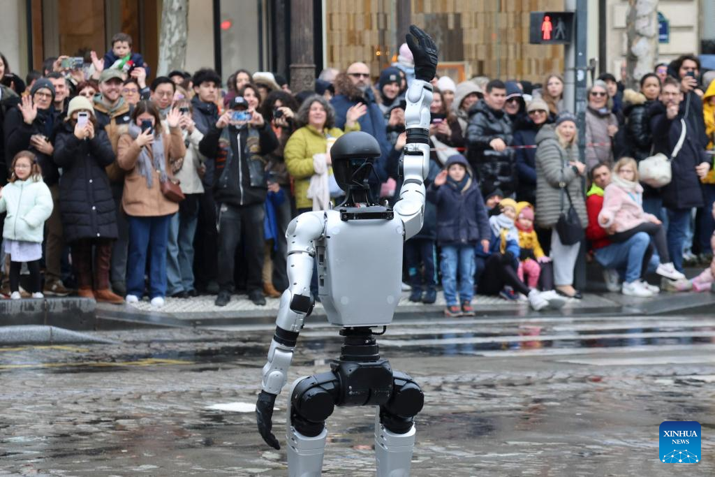 A humanoid robot, invented by a Chinese company and supplied by French technology firm INNOV8 Group, waves during a parade celebrating the upcoming Chinese New Year on the Champs-Elysees avenue in Paris, France, Feb. 1, 2026. (Xinhua/Zhang Baihui)
