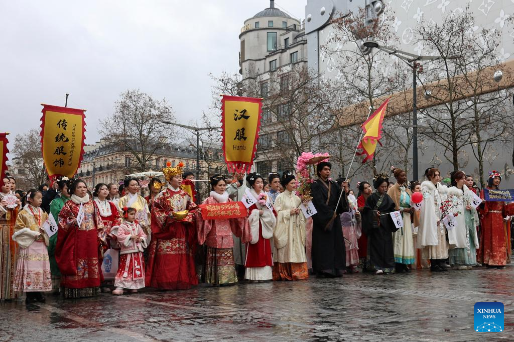 People in Chinese traditional attires perform during a parade celebrating the upcoming Chinese New Year on the Champs-Elysees avenue in Paris, France, Feb. 1, 2026. (Xinhua/Zhang Baihui)
