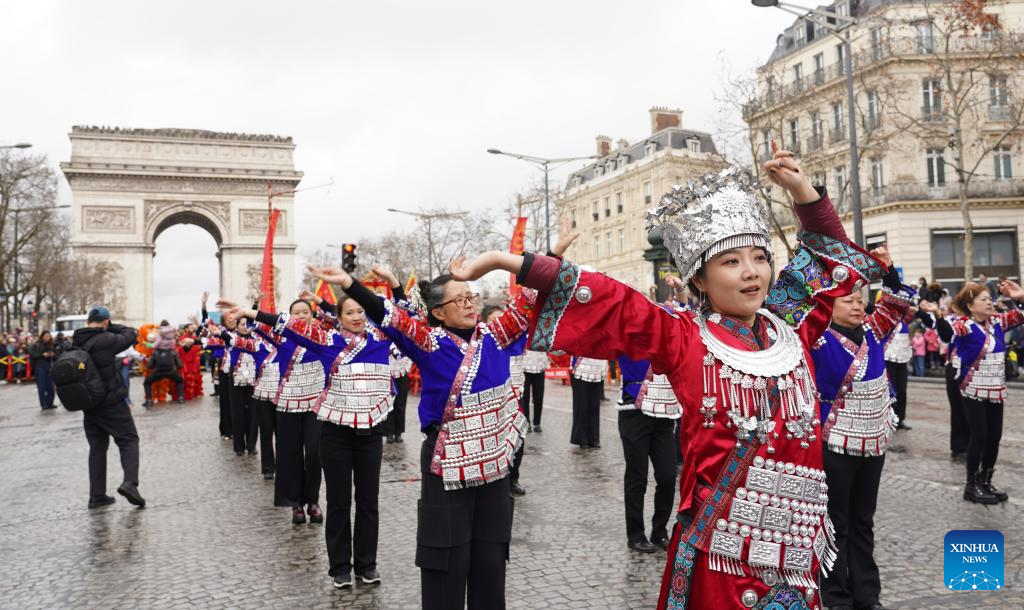 People perform traditional Miao ethnic dances during a parade celebrating the upcoming Chinese New Year on the Champs-Elysees avenue in Paris, France, Feb. 1, 2026. (Xinhua/Cui Kexin)