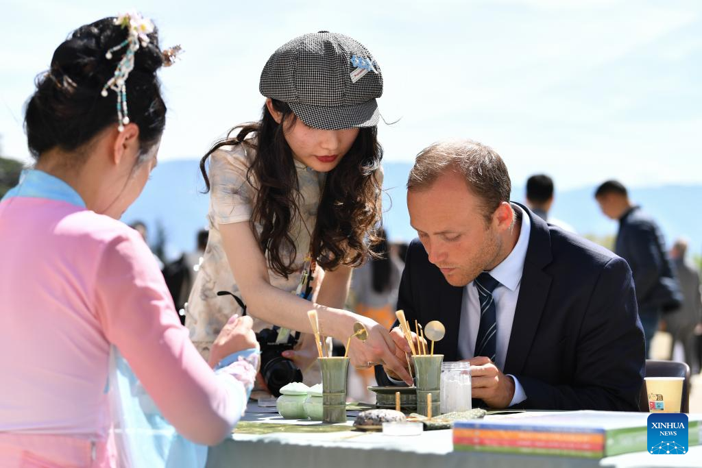 A participant tries Song Dynasty Seal Incense, a traditional incense-making technique, at the Palais des Nations in Geneva, Switzerland, April 17, 2026. A celebration marking the 2026 United Nations Chinese Language Day was held on Friday. The event drew some 400 participants, notably officials from international organizations and diplomats from over 30 countries such as Georgia, Laos, Mexico, Pakistan, Thailand, Uzbekistan, and Vietnam. (Xinhua/Lian Yi)