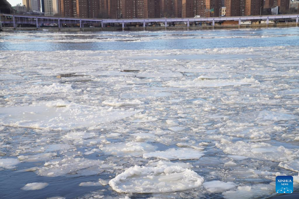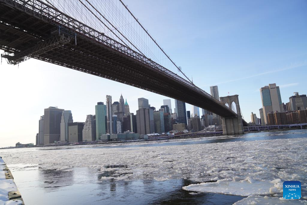 Skyscrapers are reflected in a river covered with floating ice in New York, the United States, Jan. 31, 2026. In the final week of January, a powerful winter storm swept across much of Canada and the United States, bringing widespread snow, sleet, and freezing rain, along with life-threatening cold and ice. (Xinhua/Zhang Fengguo)