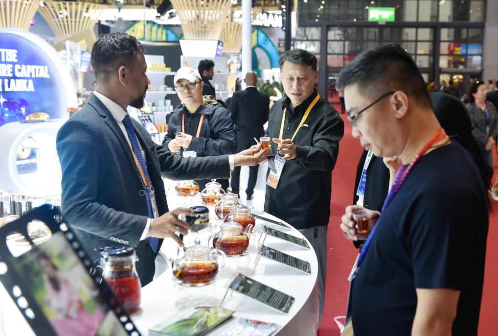 11月5日,观众在第八届进博会消费品展区品尝斯里兰卡红茶。