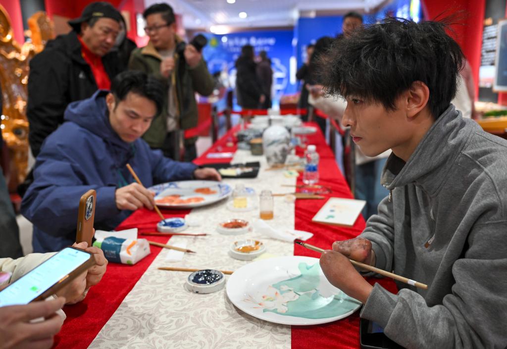 2月4日,残疾人许志阳(右一)在展览现场展示陶艺绘画。