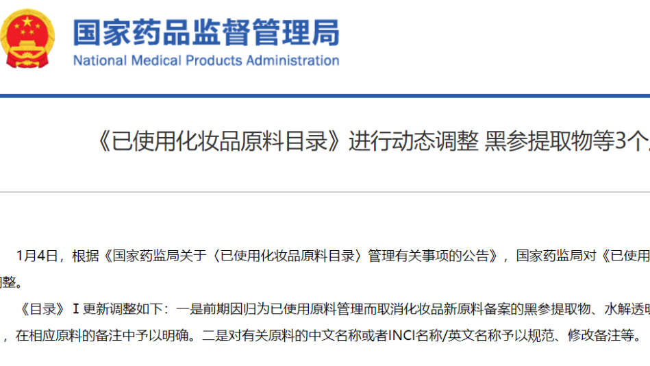 《已使用化妝品原料目錄》進(jìn)行動(dòng)態(tài)調(diào)整 黑參提取物等3個(gè)原料按照已使用原料管理