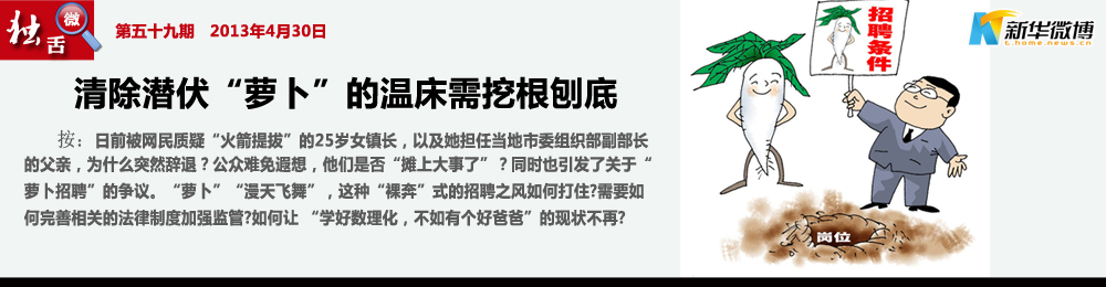 拔“蘿卜”更需祛“污泥” 對曝光的類似事件不能僅僅停留在“補改撤銷”的層面,更多的是對?!疤貦?quán)”、打“親情牌”、用公權(quán)辦私事者的嚴格問責,杜絕補改、撤銷招聘淪為一些人的免責“擋箭牌”,發(fā)現(xiàn)一起、查處一起。