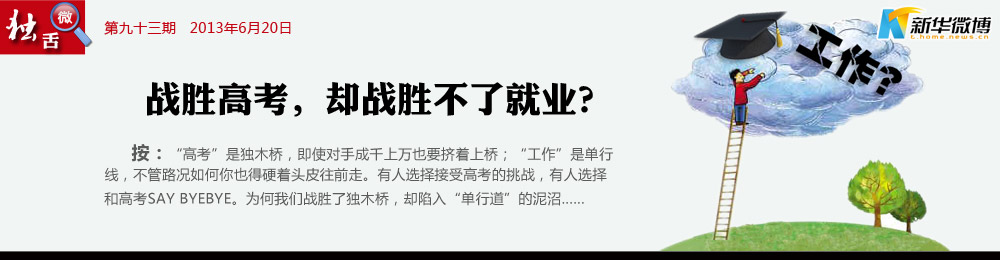 花費(fèi)了高昂的學(xué)習(xí)成本、浪費(fèi)了寶貴的年華、經(jīng)歷了非人的摧殘,結(jié)果戰(zhàn)勝了高考,卻陷入“就業(yè)難”的泥沼。當(dāng)很多大學(xué)生面臨畢業(yè)就失業(yè)、起薪比農(nóng)民工還低的時(shí)候,曾一直縈繞在耳邊的“高考成功、人生美滿”的話語(yǔ),怎么變成了一記耳光、一個(gè)笑話?