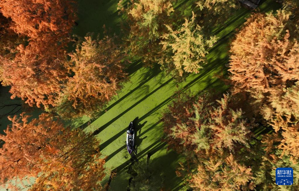 随着气温降低,浙江省杭州市青山湖的近百亩池杉、落羽杉披上色彩斑斓的“衣装”,和水面碧绿的浮萍相映成景。