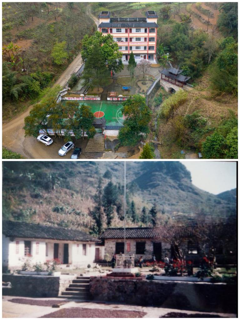 拼版照片:上图为2025年2月18日拍摄的落松地小学(无人机照片,彭奕凯摄);下图为落松地小学旧貌(资料照片,广南县委宣传部供图)。