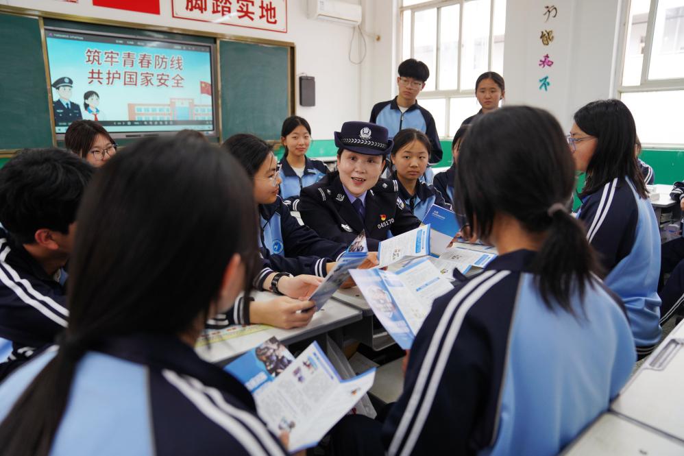 4月13日,河南省沁阳市公安局民警在沁阳市致远中学给学生讲解国家安全知识。