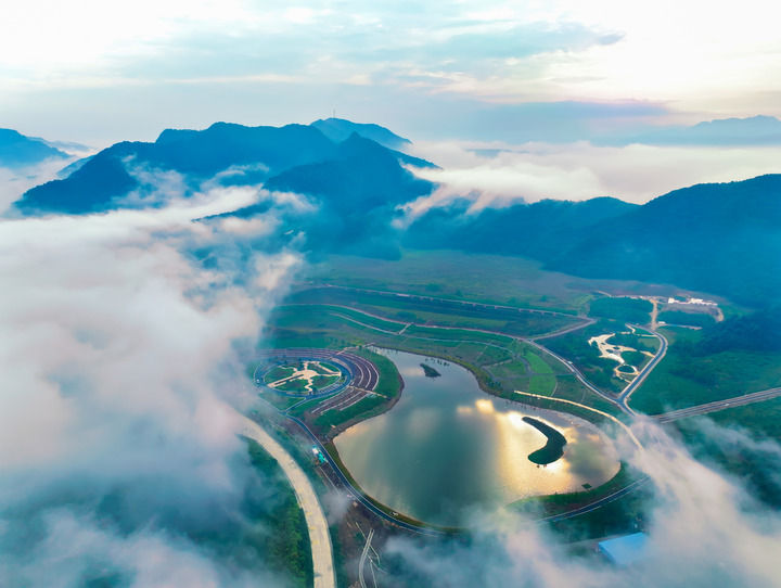 这是位于江西省九江市永修县与武宁县交界处的庐山西海与跨过水面的永武高速公路。新华每日电讯记者 周密 摄