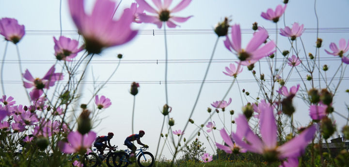 环鄱阳湖国际自行车赛在江西省南昌市高新区鄱阳湖畔举行,自行车选手正在骑行中(2019年9月28日摄)。新华社记者 周密 摄