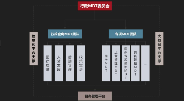院领导及所有行政后勤中层组成医院行政MDT委员会,负责医院重大规划、重大项目、重点工作推进,以及需院部协调解决的出现的困难。以国家政策导向或医院发展瓶颈问题(如“国考”指标提升、药品耗材管控、DRG支付改革、智慧医院建设)为靶点组建专项MDT工作组,集中优势力量,开展专项攻关。行政查房MDT深入临床医技科室现场,快速响应、协调解决一线提出的具体、跨部门问题和困难。同步搭建信息化平台、大数据平台、督办管理平台,打通各部门数据壁垒,实现医疗运行、财务收支、医保合规等数据的实时共享,为决策提供“数据仪表盘”,为工作落实提供“执行路线图”。