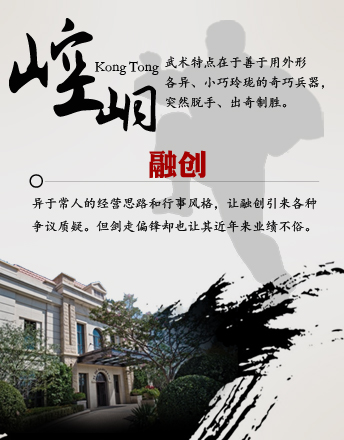 融創(chuàng) 崆峒派 崆峒武術(shù)特點(diǎn)在于奇兵,外形各異、攜帶方便, 往往暗藏于袖筒和靴筒中,交手中往往突然出擊取勝。今年頻頻拿地,其異于常人的經(jīng)營(yíng)思路,讓孫宏斌招致各種爭(zhēng)議和質(zhì)疑。