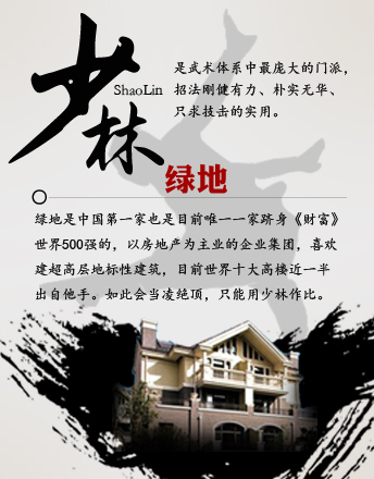 綠地 少林派 少林是體系最龐大的門派,招法剛健有力、攻防兼?zhèn)?、樸?shí)無(wú)華。 綠地是中國(guó)首家躋身《財(cái)富》世界500強(qiáng)的,以房產(chǎn)為主業(yè)的企業(yè)。項(xiàng)目遍及全國(guó),世界十大高樓近一半來(lái)自綠地。