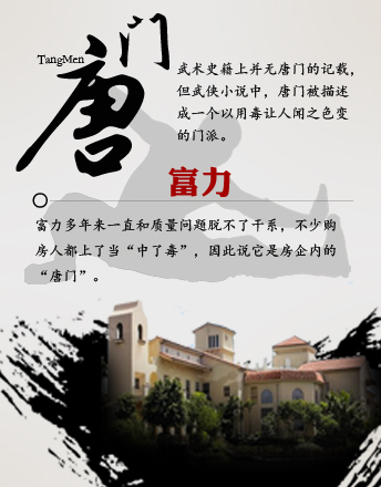 富力 唐門 唐門用毒之名,天下皆知。 富力擁有一級(jí)開(kāi)發(fā)資質(zhì),卻總是遭業(yè)主維權(quán)。因壓縮成本、過(guò)快擴(kuò)張導(dǎo)致的質(zhì)量問(wèn)題一再曝光。讓購(gòu)房人后悔不迭,因此說(shuō)富力是房企內(nèi)的“唐門”。