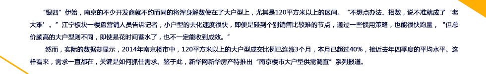 據(jù)黃媛分析,大戶型的熱銷主要原因有二。一是片區(qū)規(guī)劃的利好,周邊配套逐步成熟,吸引了主城區(qū)的客戶。而是其他片區(qū)單價(jià)昂貴,直接導(dǎo)致大戶型總價(jià)“離譜”,若想在南京改善居住品質(zhì),那么只有選擇還處于價(jià)格洼地的江北。黃媛認(rèn)為300萬是個(gè)臨界點(diǎn),如果大戶型總價(jià)在300萬以內(nèi),購(gòu)房者是可以接受的,但如果超過300萬,開發(fā)商就會(huì)比較頭疼房子怎樣才能賣出去。