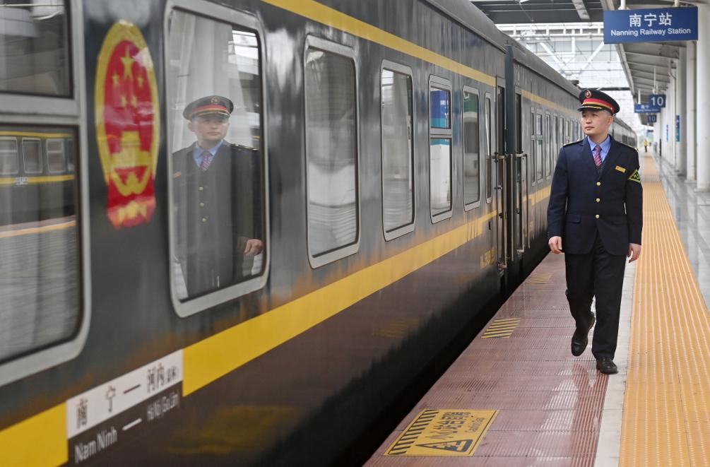 2月11日,在中国广西南宁站,中越国际联运旅客列车列车长黄俊杰在乘客下车后巡视检查列车情况。新华社记者 陆波岸 摄