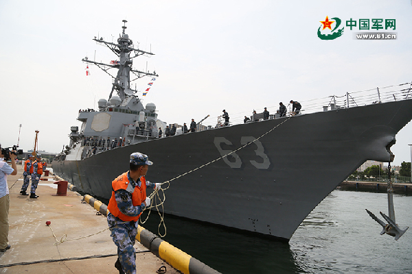 ??? The Arleigh-burke class guided-missile destroyer USS Stethem (DDG 63) of the U.S. Navy arrives in Qingdao, a port city in east China's Shandong province, on the morning of July 28. (Chinamil.com.cn/ Wang Songqi)