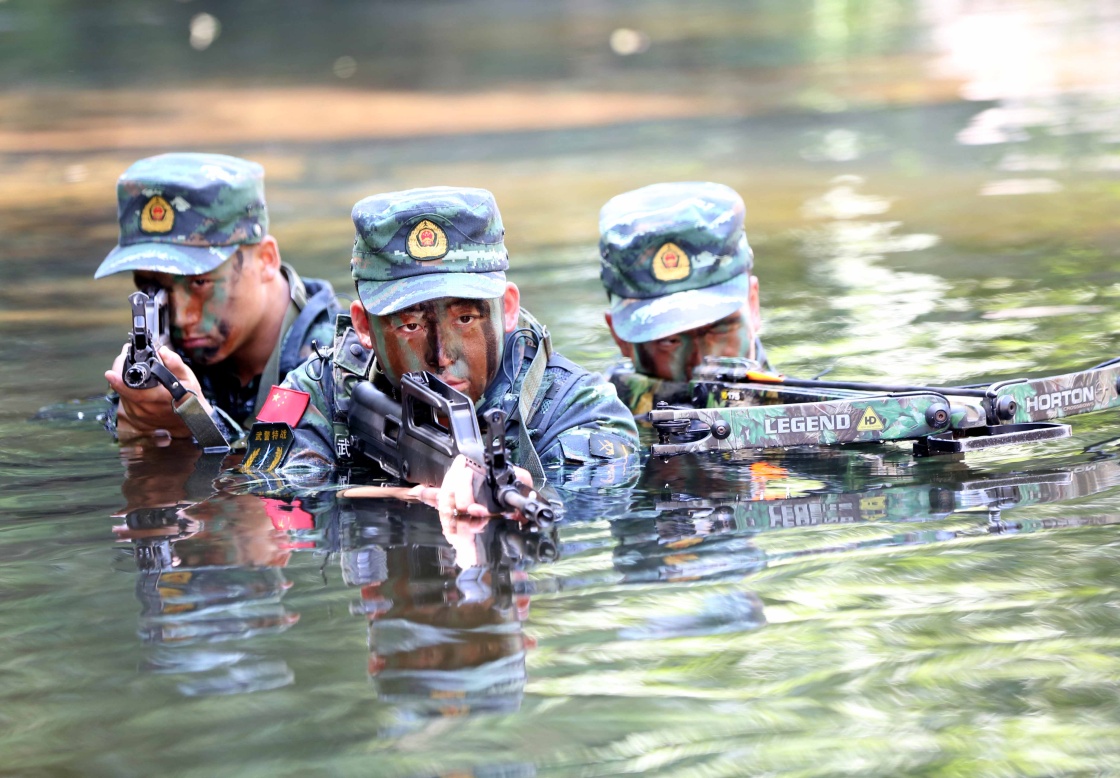 ????當(dāng)日,武警山東總隊煙臺支隊組織特戰(zhàn)狙擊手冒著34攝氏度的高溫來到昆崳山開展叢林訓(xùn)練。狙擊手們身穿偽裝服圍繞野外生存、偽裝潛伏、極限體能等6項17個課目進行綜合訓(xùn)練,在實戰(zhàn)背景下磨礪狙擊手野外生存技能和戰(zhàn)術(shù)素養(yǎng),鍛造反恐處突利刃。新華社記者 朱崢 攝