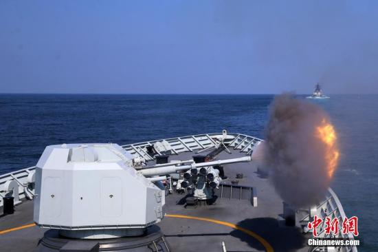 9月18日,“黃山艦”主炮開(kāi)炮。當(dāng)日,中俄“海上聯(lián)合-2016”軍事演習(xí)展開(kāi)實(shí)際使用武器演練。 中新社記者 韓海丹 攝