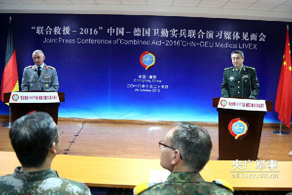“聯(lián)合救援-2016”中國-德國衛(wèi)勤實兵聯(lián)合演習媒體見面會現(xiàn)場。鄧曦光 攝
