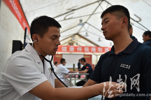 圖為醫(yī)護(hù)人員使用聽診器對(duì)隊(duì)員身體進(jìn)行檢查