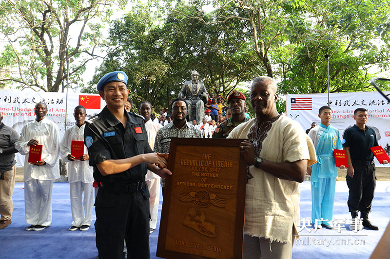 ????交流活動還舉行了“中利文化武術交流使者”聘任儀式。在中國駐利比里亞大使張越、利比里亞總參謀長贊凱、教育部部長喬治?沃納等官員的見證下,中國防暴隊政委徐曉偉、利國武協(xié)主席普萊特代表中利武術聯(lián)誼單位,相互交換了紀念品,給8名中利文化武術交流使者頒發(fā)了聘書、并掀展聯(lián)誼旗幟合影留念,得到現(xiàn)場官員、師生雷鳴般掌聲和高呼贊賞。