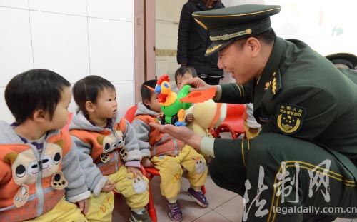 ????12月28日,廣東公安邊防總隊中山邊防支隊橫門水上邊防派出所聯(lián)合民眾鎮(zhèn)義工服務(wù)隊開展新年集體認(rèn)親活動,邊防官兵和義工人員走進中山市兒童福利院與小朋友結(jié)對認(rèn)親,“兵爸爸”給“兒女們”送來了玩具、糖果、學(xué)習(xí)用品等新年禮物,并與“兒女們”一起玩老鷹抓小雞、有獎問答、拍拍手等游戲,一家人用歡聲與快樂迎接新一年的到來。(肖亭 宗志鵬)