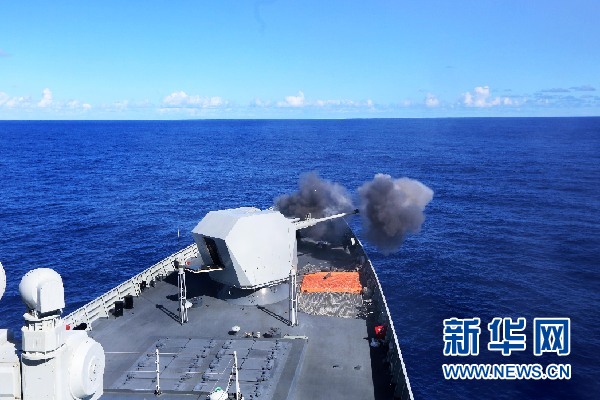 2月19日,在海上現(xiàn)場反擊演練中,長沙艦對“敵艦”進行主炮火力射擊。