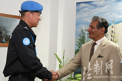 圖為聯(lián)利團(tuán)秘書(shū)長(zhǎng)特別代表法里德·扎里夫接見(jiàn)防暴隊(duì)陳利華政委