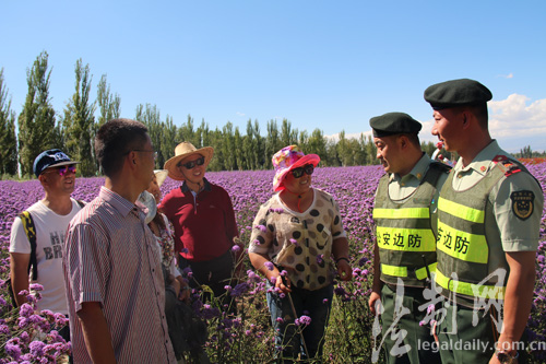????每年6月、7月,數(shù)萬(wàn)畝薰衣草爭(zhēng)相怒放,匯成一片紫色的海洋,吸引大量游客前去觀賞。新疆公安邊防總隊(duì)伊犁邊防支隊(duì)梁三宮邊防派出所官兵因地制宜打造“紫郁之鄉(xiāng)110”這一特色警務(wù),在治安防控、服務(wù)群眾、素質(zhì)提升等方面走出了一條新路子,用使命、責(zé)任與情感為游客保駕護(hù)航,讓游客享受一趟“滿(mǎn)意之旅”。