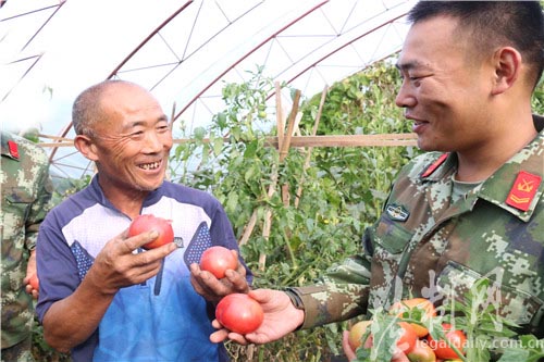 圖為當?shù)剞r(nóng)民稱贊官兵自己種植的西紅柿