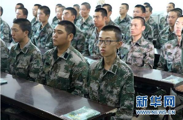 ????資料圖片: 2017年10月2日,在駐守在遼東半島的第79集團(tuán)軍某旅新兵營(yíng),蔚晨陽(yáng)(前右一)在認(rèn)真聽課。新華社發(fā)(王立軍 攝)