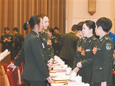 ??? 三月七日上午,出席十三屆全國人大二次會(huì)議的解放軍和武警部隊(duì)代表團(tuán)舉行第一次全體會(huì)議。會(huì)議間隙,女代表們相互討論交流。解放軍報(bào)記者 馮凱旋攝