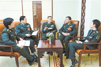 本報(bào)記者鄒維榮(左一)、柴華(右一)采訪(fǎng)軍隊(duì)政協(xié)委員曲新勇、王健、吳剛(左二至左四)。中國(guó)軍網(wǎng)記者 孫智英 攝