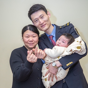 拼版照片:左圖為2月10日,在重慶市渝中區(qū)的家中,付寶印抱著兒子和妻子孫夢潔比出心形手勢(新華社記者 黃偉 攝);右圖為2月9日,付寶印的母親鐘士輝在吉林省長春市農(nóng)安縣楊樹林鄉(xiāng)牛尾巴山村家中比出心形手勢(新華社記者 張楠 攝)。