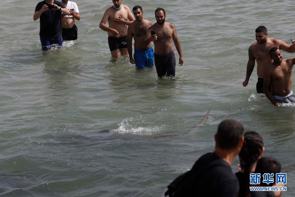 4月20日,在以色列北部城市哈代拉的海邊,鯊魚(yú)從人們身邊游過(guò)。