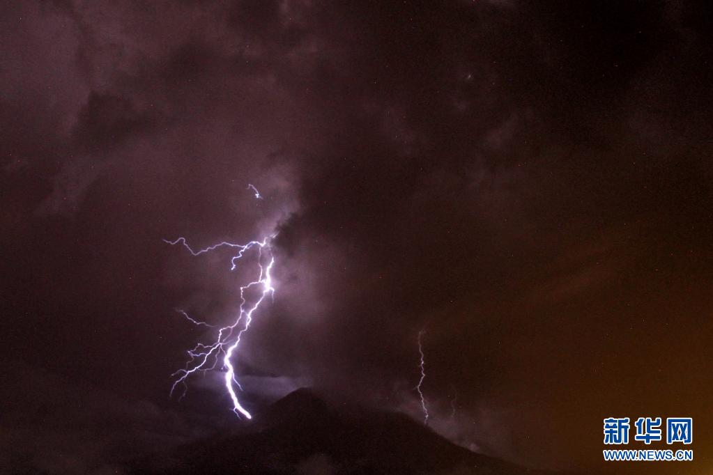 這是5月13日在印度尼西亞北蘇門答臘省拍攝的錫納朋火山上空的閃電(長(zhǎng)時(shí)間曝光照片)。